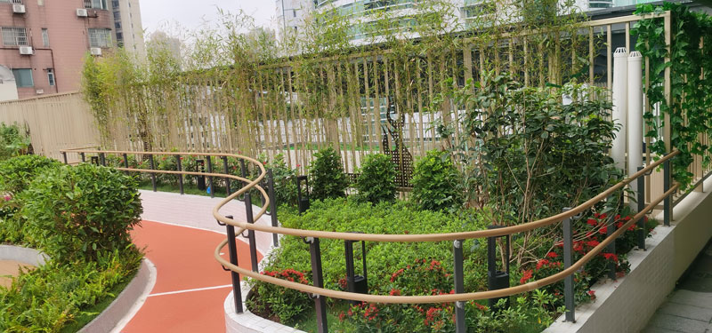 同時,頂樓設(shè)有屋頂康復花園,采用了我們公司提供的能隨處折彎的室外抗菌扶手。如圖二/圖三: